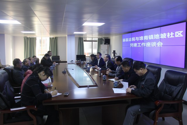 为深入贯彻党的十九大精神,深化“双报到”工作,创建“美好社区”,12月8日下午,藤县人民法院与埌南镇地坡社区党建工作座谈会在藤县人民法院顺利召开。县法院党组书记、院长石忠贵,党组成员、副院长王文禄,党组成员、副院长高云,党组成员、政工科科长苏植彬等11人及埌南镇地坡社区党支部书记刘柱新等4名社区干部参加了这次会议。