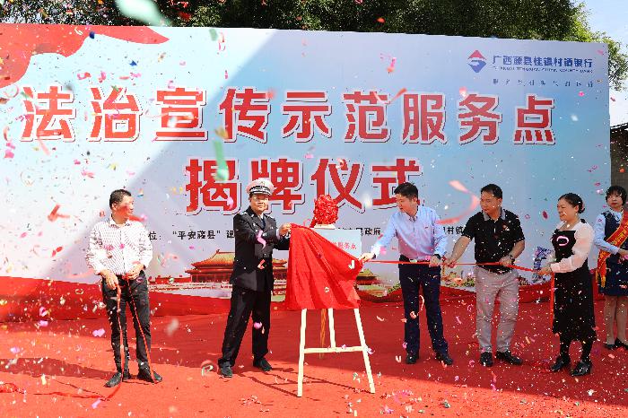 原来,县委政法委、太平镇人民政府、广西藤县桂银村镇银行在这里举行“法治宣传示范服务点”揭牌仪式,这标志着藤县“政企协作法治宣传大篷车”正式开启。