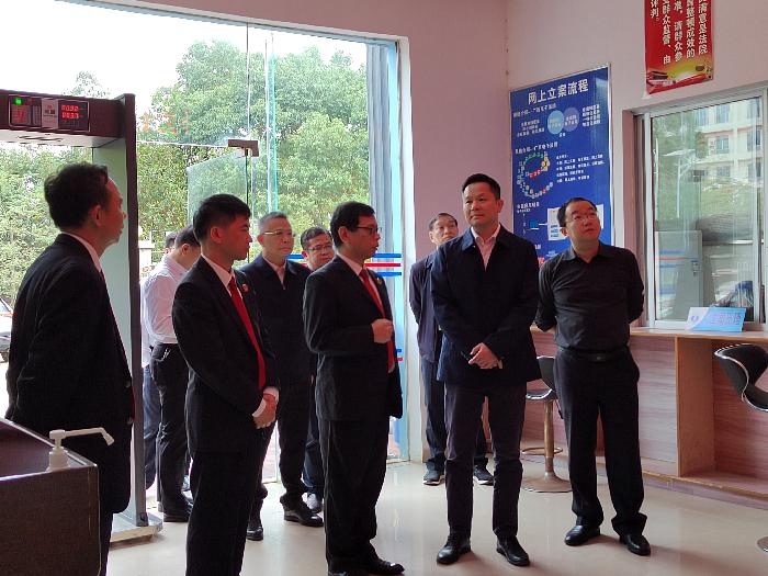 11 月2 日,梧州市委常委、政法委书记邓旭升到藤县调研群众安全感、基层社会治理和禁毒等工作,看望慰问奋战在基层执法办案一线的政法干警。市委政法委副书记肖永生,藤县县委书记杜诚,县委常委、政法委书记于新,副县长、县公安局局长周戈,县法院院长吴汉北,县检察院检察长叶耀隆陪同调研。
