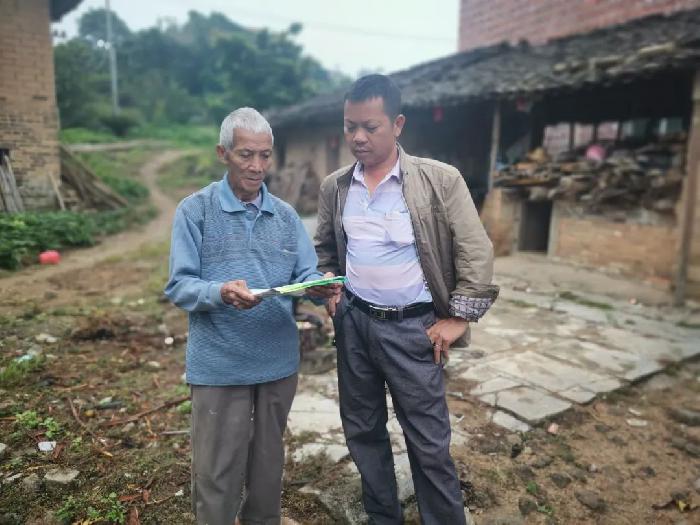 图为迥龙村支书梁永超(退伍军人)与禁毒社工入户宣传禁毒知识