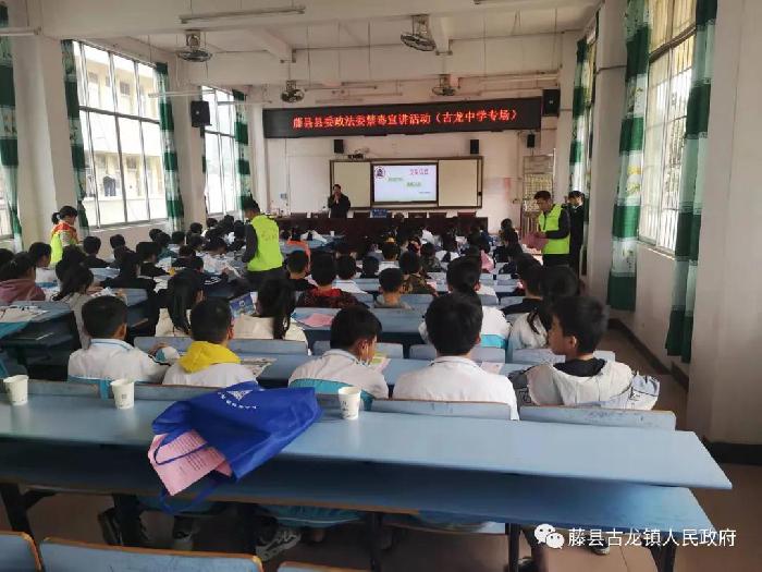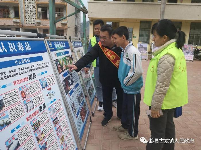 在古龙第一中学现场摆放有关禁毒方面的知识,镇综治办负责人黄宏钧为同学们讲解禁毒知识和毒品的危害,让学生们进一步加深对毒品危害的了解,自觉拒绝吸毒。