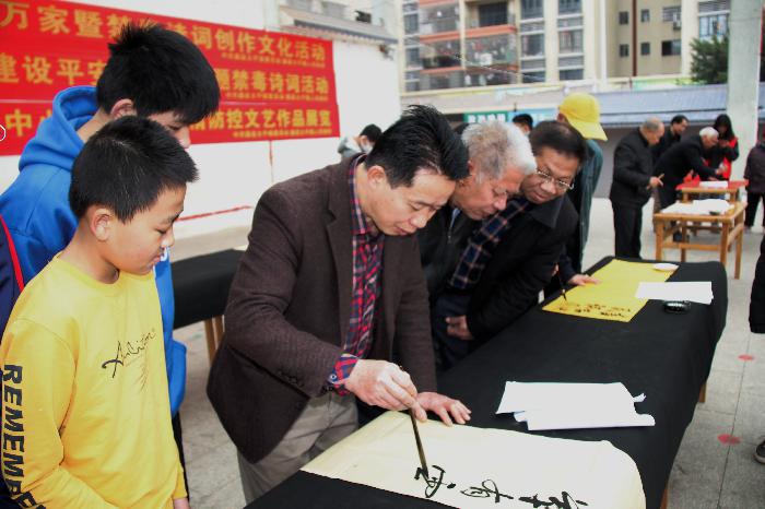 活动现场,太平诗社、太平书协学者以禁毒为主题进行诗词创作。他们文思泉涌,只看其笔走龙蛇,灵韵飞扬,顷刻间大作已成。创作完毕,共献上40多篇原创诗词,读来通俗易懂、朗朗上口。与此同时,前来观展的群众也体验了一把禁毒诗词“小小创作者”的成就感,他们品味上下联,充分思考,发挥才智,为空缺的禁毒诗词添上了神来之笔,参与人次超70人,有效地筑牢了我镇的禁毒防线,进一步深化了我镇平安建设工作。