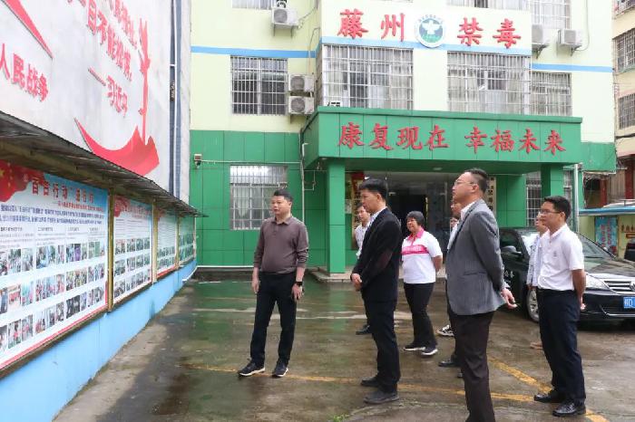 5月8日上午,象棋镇党委书记李斌传带队到藤州镇社区戒毒社区康复中心交流禁毒工作经验,镇党委书记李培川、镇人大主席覃永玲、镇党委政法委员何炼华等陪同。象棋镇禁毒工作组参观了藤州镇社区戒毒社区康复中心,对藤州镇取得的禁毒工作成效表示肯定,并表示此行收益良多。