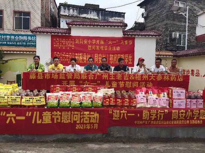在六一儿童节到来之际,为关心关爱未成年人健康成长,传递社会爱心,让生活困难孩子健康快乐成长,5月23日,县市场监管局携手藤县茉茶风暴茶饮连锁、广西国大嘉进医药连锁、梧州市大参林连锁药店有限公司、广州王老吉到金鸡镇同安小学开展“六一”儿童节慰问困难学生活动,为生活困难的孩子们送上慰问品和节日的祝福。